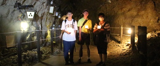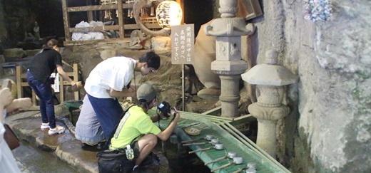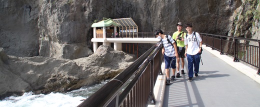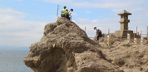 奥行152mの第一岩屋と奥行56m、龍神伝説の地といわれる第二岩屋があります。入り口でいただいたロウソクを片手に、石像や岩壁が見られます。稚児ヶ淵から岩屋へ、海岸伝いに高架の遊歩道があり、部員たちは、今、高1地理総合の授業でやっている波食棚や海食洞を眺めながら散策しました。