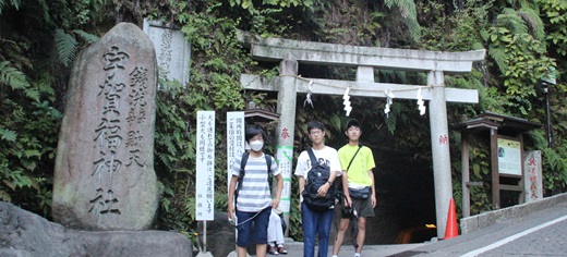 次に、江島神社(奥津宮)を見学してから、海食崖を下り、稚児ヶ淵より海の景色を眺め、江の島岩屋へ行きました。江の島岩屋は、江の島の太平洋側にある海食洞です。弘法大師や日蓮上人が修行した所といわれ、江の島信仰の発祥地として崇められてきました。1182には、源頼朝が奥州藤原秀衡征伐を祈願したとも伝えられています。