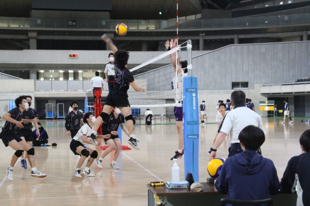 2試合目の明大中野戦は、1セット目の中盤までは本校優位で進んだが、途中5連続失点してしまう場面もあり、最後まで気の抜けない展開となった。しかし、攻めの気持ちをもって挑み続け最後は振り切ることができた。2セット目も常にリードは保ちつつも連続失点してしまう場面もあり、一気に抜け出せない展開となったが、最後まで集中力を切らすことなく戦い抜き勝つことができた。