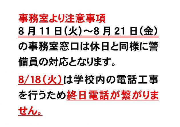 夏休み期間中(8/11~8/21)の事務室各種取り扱いについて(重要)